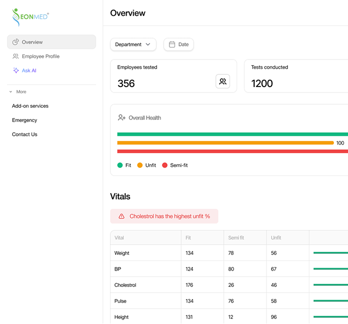Integrated into EONMed’s enterprise workflow, this AI-powered tool empowers frontline health workers and HR teams to identify early signs of illness, monitor chronic conditions, and trigger timely medical interventions — all with a simple glance.